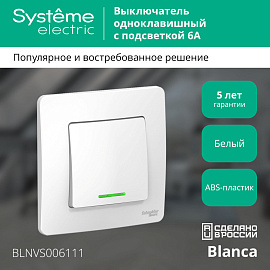 Выключатель одноклавишный BLANCA скрытой установки 6А 250В с подсветкой (cх.1)а в сборе белый BLNVS006111 Systeme Electric