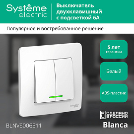 Выключатель двухклавишный BLANCA скрытой установки 6А 250В с подсветкой (сх.5а) механизм с накл белый BLNVS006511 Systeme Electric
