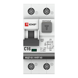 Выключатель автоматический дифференциального тока АВДТ 16А 2П двухполюсный характеристика C 6kA 30мА тип A электронный АВДТ-63 DA63-16-30e EKF